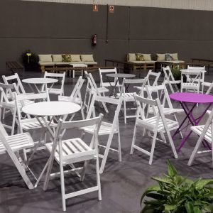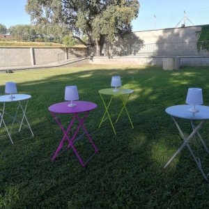 Mesitas metálicas de colores gris, verde y rosa para decoración de zona bar o zona infantil.