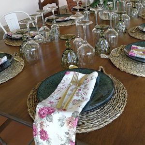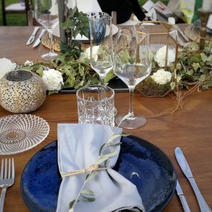 Platos de colores oscuros de 27 cm. Están en azul, verde y gris.