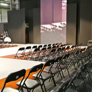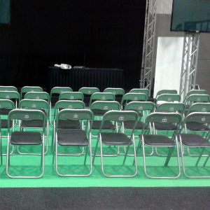 Silla plegable tapizada en negro y estructura plateada o negra. Ideal para conferencias.