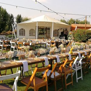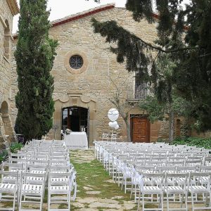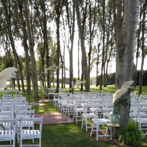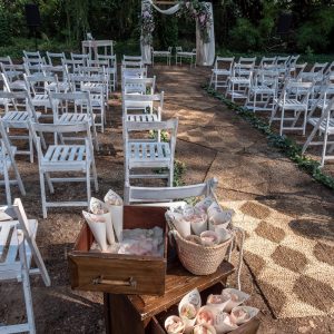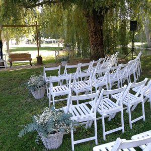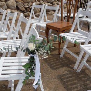 Cadira plegable vintage blanca de fusta. La més usada per a cerimònies a l’aire lliure
