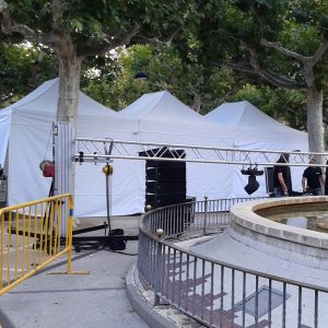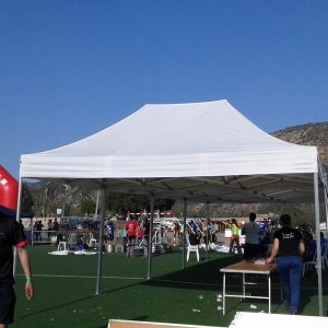 Carpes plegables blanques, de 4,5 x 3 m, que es poden unir entre elles o amb les de 3 x 3m i tancar amb laterals.